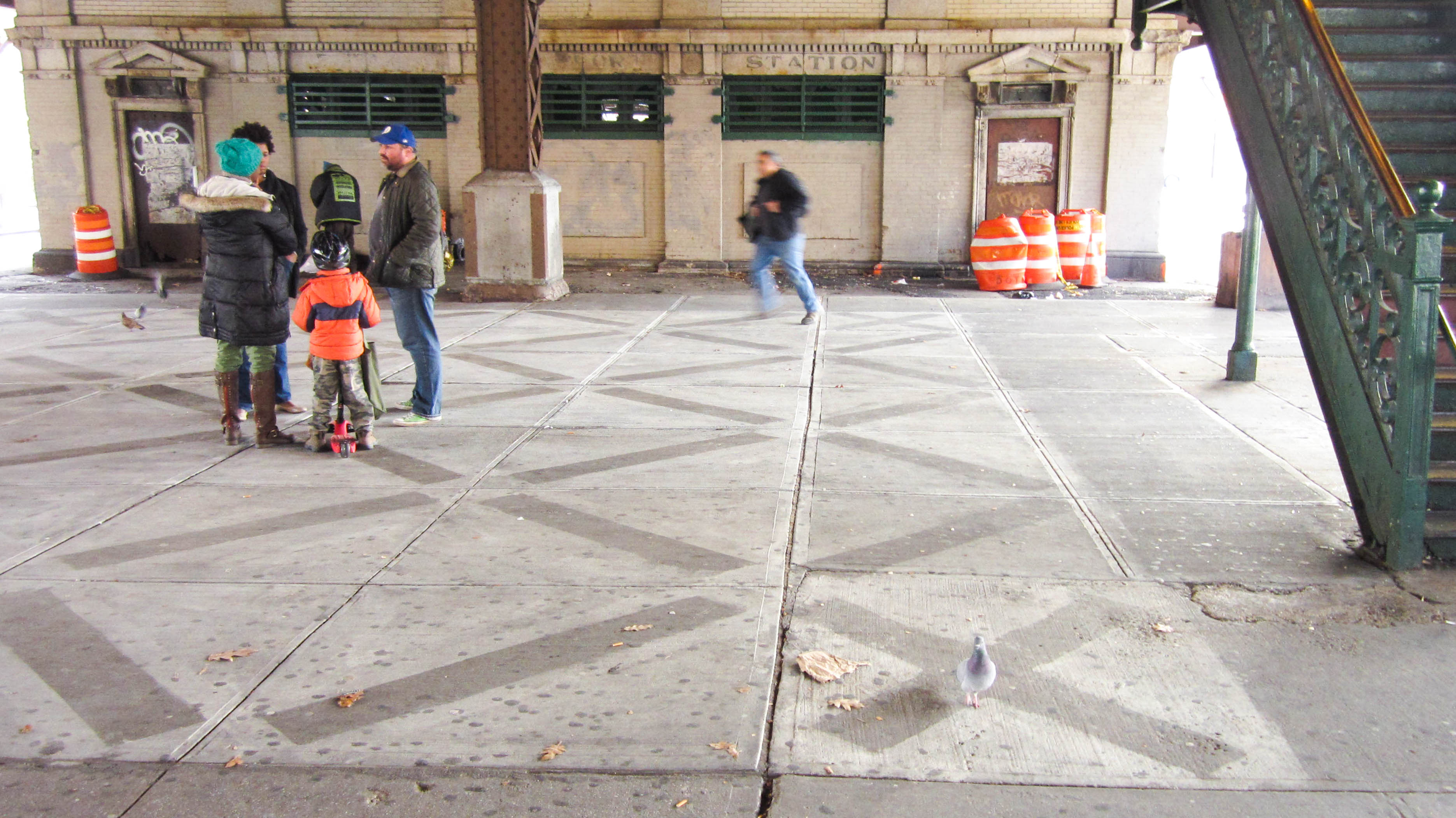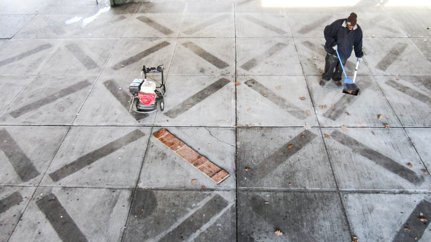 Drawing with dirt. Drawing with a pressure-wash machine, I created a palazzo floor pattern with settled metal dust from above-ground train tracks.